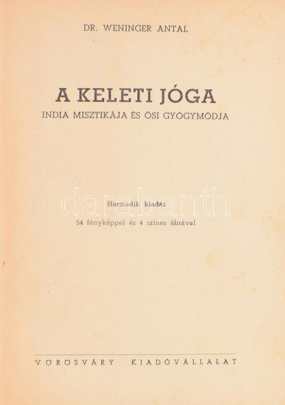 Dr. Weninger Antal: A keleti jóga. India misztikája és ősi gyógymódja. H.n., Vörösváry Kiadóvállalata. Kiadói félvászon kötés, gerinc szakadt, kopottas állapotban.