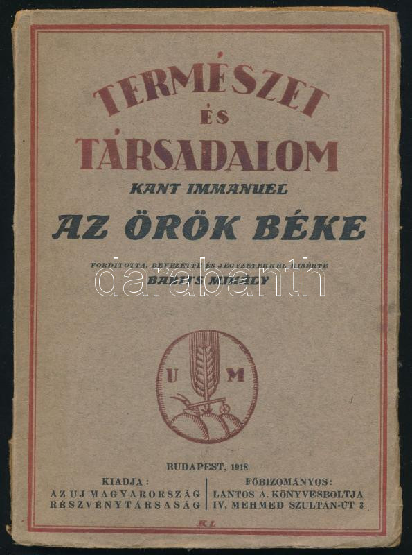 Kant Immánuel: Az örök béke. Ford., bev. és jegyzetekkel kísérte Babits Mihály. Természet és társadalom 1. sz. Bp., 1918, Uj Magyarország. Kiadói papírkötés, sérült gerinccel.