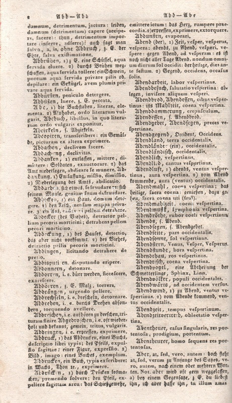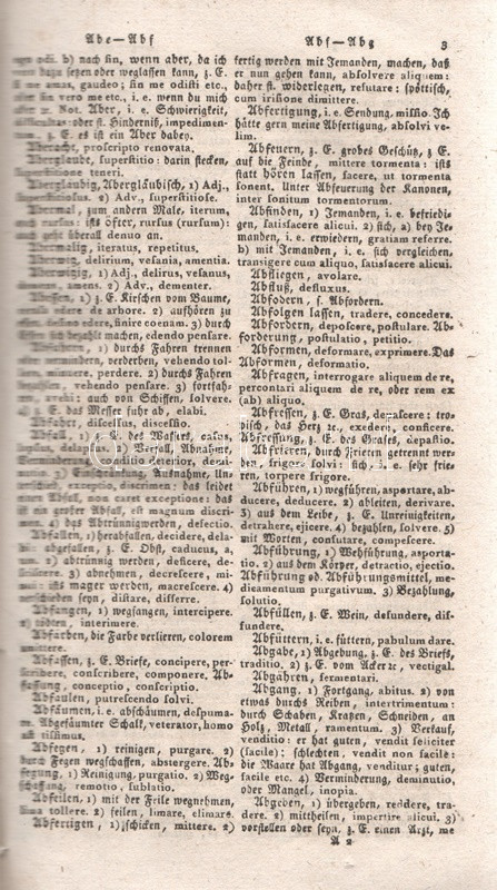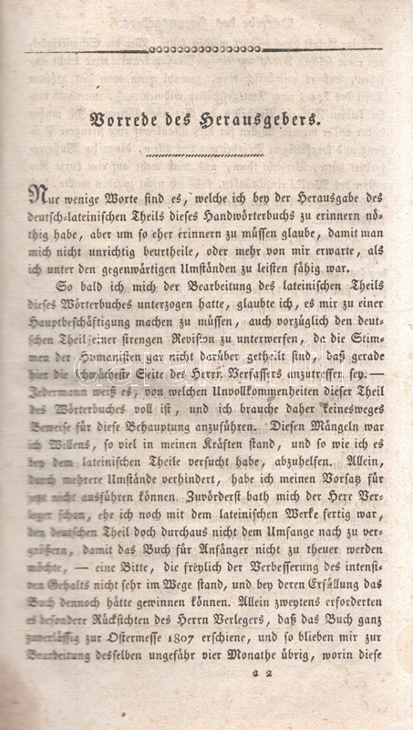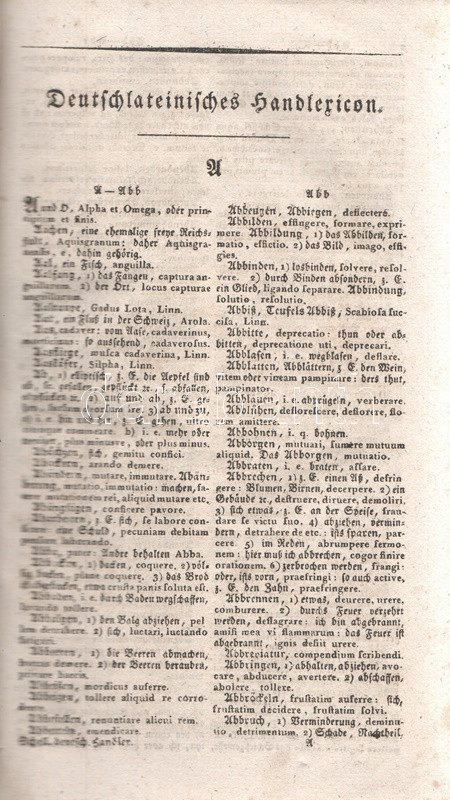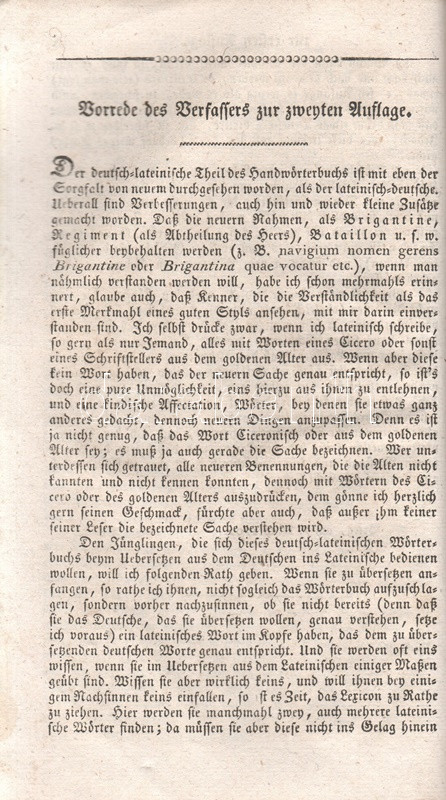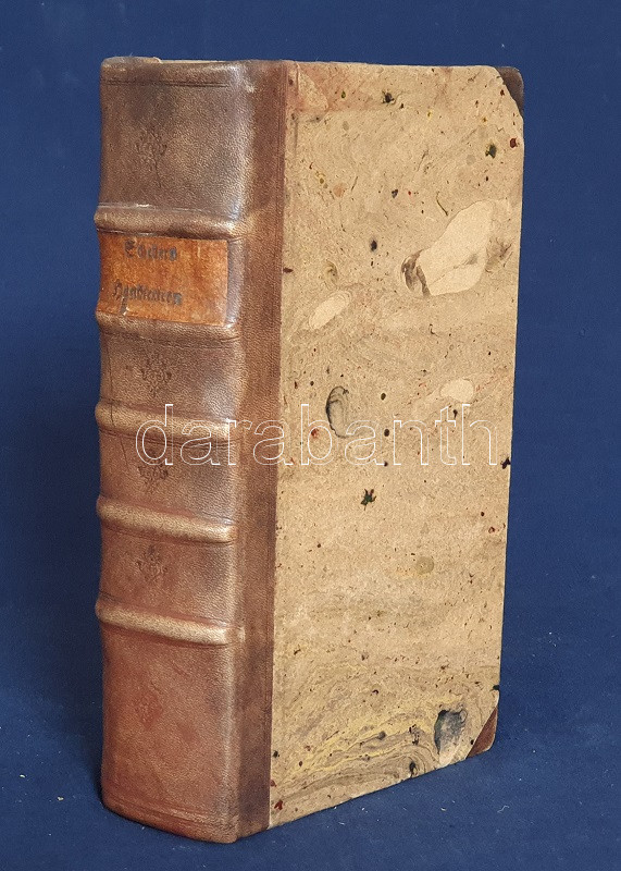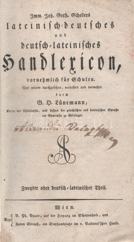 Scheller, Immanuel Johann Gerhard: Imm. Joh. Gerh. Schellers Lateinisch-deutsches und deutsch-lateinisches Handlexicon, vornehmlich für Schulen. Von neuem durchgesehen, verbessert und vermehrt durch G. H. Lünemann. Zweyter oder deutsch-lateinischer Theil. [Bécs] Wien, (1807). Bey B. Ph. Bauer und Anton Strauss. XII + 940 p. Immanuel Johann Gerhard Scheller (1735-1803) német klasszika-filológus és lexikográfus, szótárszerkesztő, előbb a brandenburgi Lübben líceumának rektora, majd a sziléziai Brieg város királyi gimnáziumának professzora és igazgatója. 1783-tól jelentek meg monumentális német-latin szótárai, az újabb kiadásokban egyre nagyobb terjedelemben, 1792-ben pedig kiadta tömörebb, német-latin és latin-német szótárát. Halála után a göttingeni klasszika-filológus Georg Heinrich Lünemann (1780-1830) átdolgozta szótárait, példányunk az 1807. évi kiadásból származik, a két irányú szótárnak magában is megálló, német-latin kötete. Kéthasábos szövegoldalakkal. A címlapon régi tulajdonosi bejegyzés, néhány oldalon apró, halvány lapszéli foltosság, az utolsó levél sarkán kisebb pótlás. XX. század második feléből származó, álbordázott, vaknyomásos félbőr kötésben, színes festésű lapszélekkel. A címfelirat a gerincen vörös címkén. Jó példány.