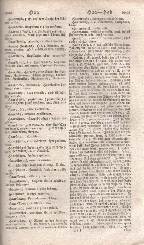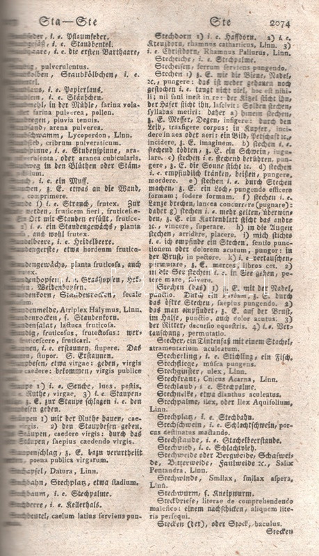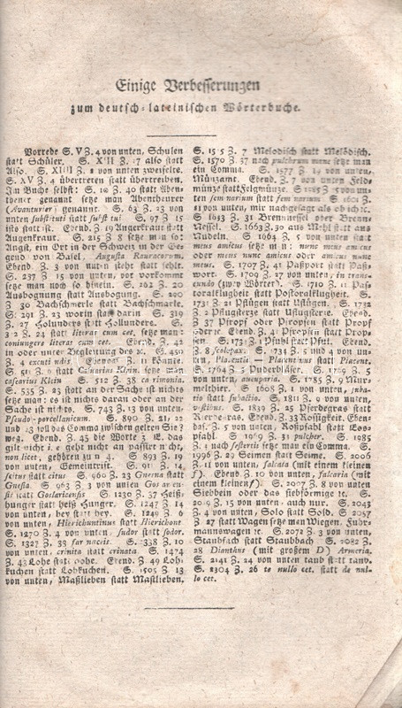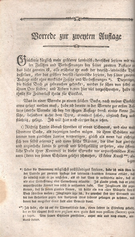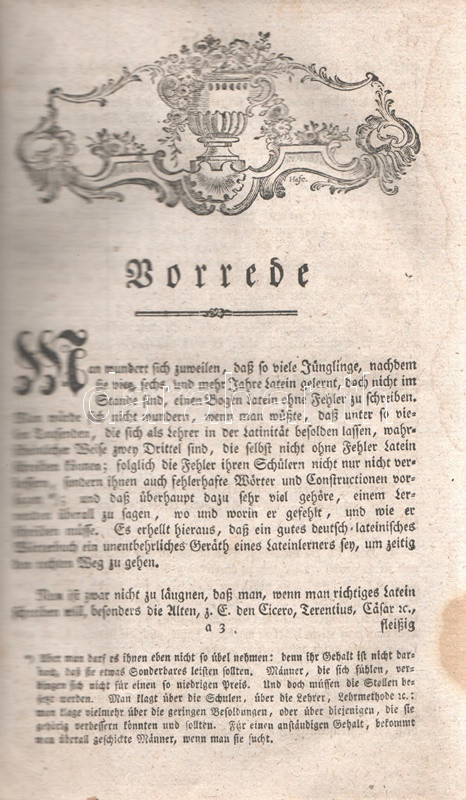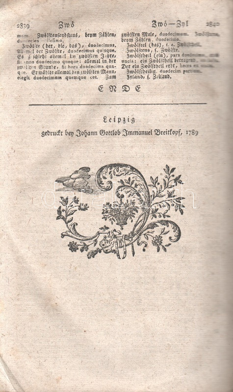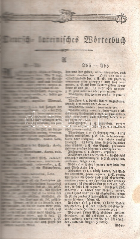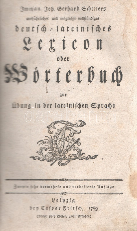 Scheller, Immanuel Johann Gerhard: Imman. Joh. Gerhard Schellers ausführliches und möglichst vollständiges Deutsch-lateinisches Lexicon oder Wörterbuch zur Übung in der lateinischen Sprache. Zweyte sehr vermehrte und verbesserte Auflage. [Lipcse] Leipzig, 1789. Bey Caspar Fritsch. XXXX p. + 2840 hasáb + [2] p. Immanuel Johann Gerhard Scheller (1735-1803) német klasszika-filológus és lexikográfus, szótárszerkesztő, előbb a brandenburgi Lübben líceumának rektora, majd a sziléziai Brieg város királyi gimnáziumának professzora és igazgatója. Jelentős, iskolai használatra szánt német-latin szótárát először 1783-ban adta ki, példányunk az 1789. évi második, javított, bővített kiadásból származik. Kéthasábos szövegoldalakkal. Néhány oldalon apró, halvány foltosság. Öt bordára fűzött, aranyozott gerincű korabeli bőrkötésben, kézzel festett előzékekkel, vörös festésű lapszélekkel. A gerincen a címfelirat sárga címkén, a kötéstáblákon apró kopások. Szép példány.