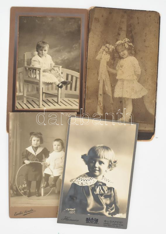 cca 1900-1910 Gyermekportrék, 4 db keményhátú fotó, különböző műtermekből (Hunnia, Mai és Társa, stb.), változó állapotban, 16x10 cm és 20x12 cm között