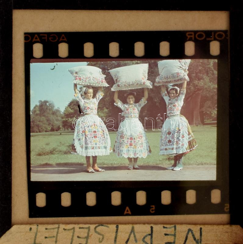 Beschreibung: cca 1940 Lányok hímzett párnával, piros ruhában, színes Agfacolor diapozitív, 4×3,5 cm