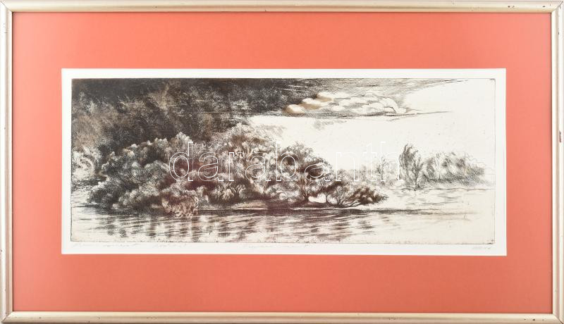 Beschreibung: Olexa József (1960-): Dunai sziget. Rézkarc, papír, jelzett, egyszeri nyomat, üvegezett keretben, 20×50 cm