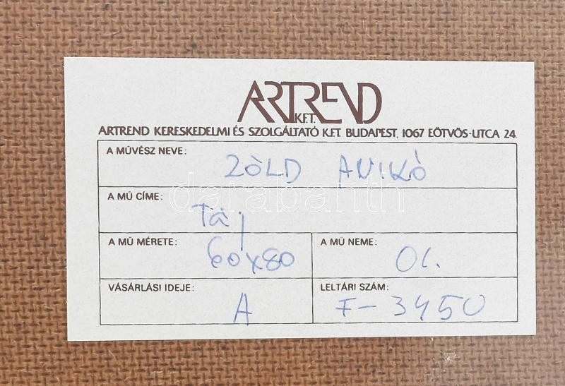 Beschreibung: Zöld Anikó (1942-): Táj. Olaj, farost, jelzett. Hátoldalán Képcsarnok Vállalat és Artrend címkéjével. 60x80 cm