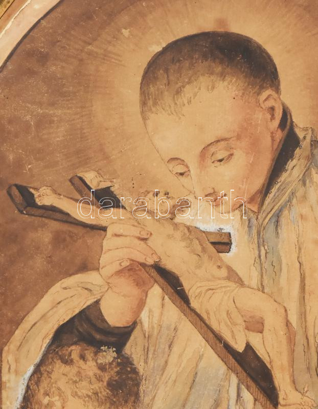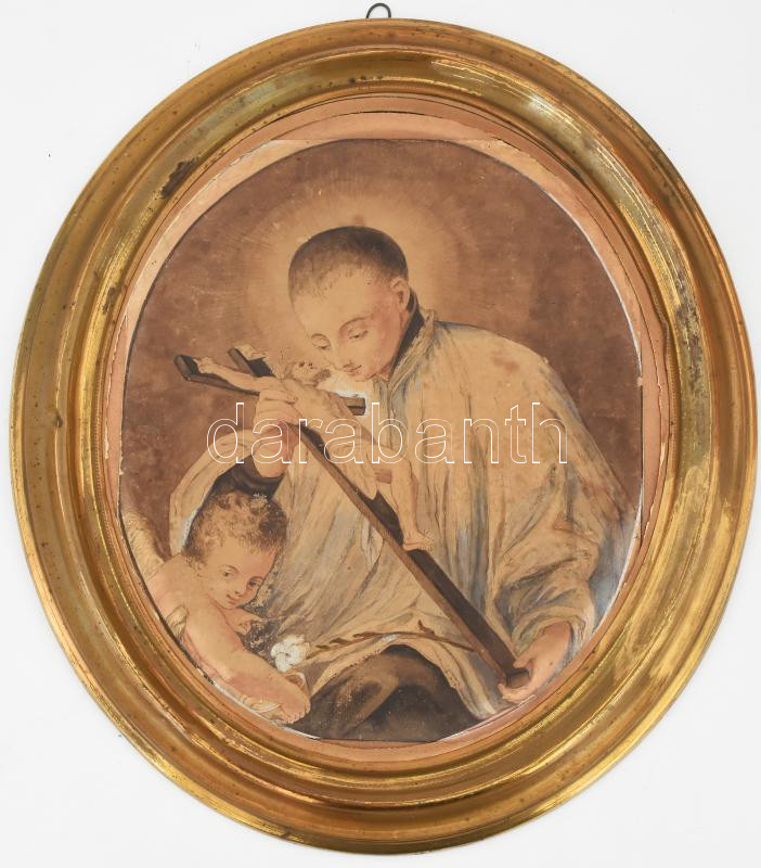Jelzés nélkül, feltehetően XVIII. sz. második fele-XIX. sz. első fele: Gonzaga Szent Alajos puttóval. Akvarell, papír. Kissé sérült. Antik, kissé deformált réz keretben. 31x26 cm