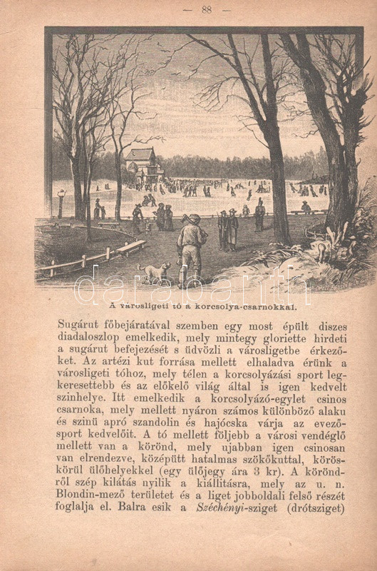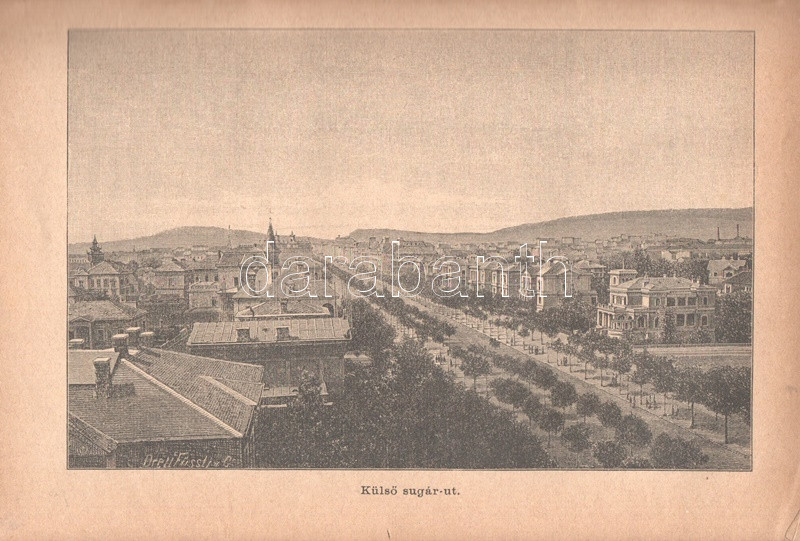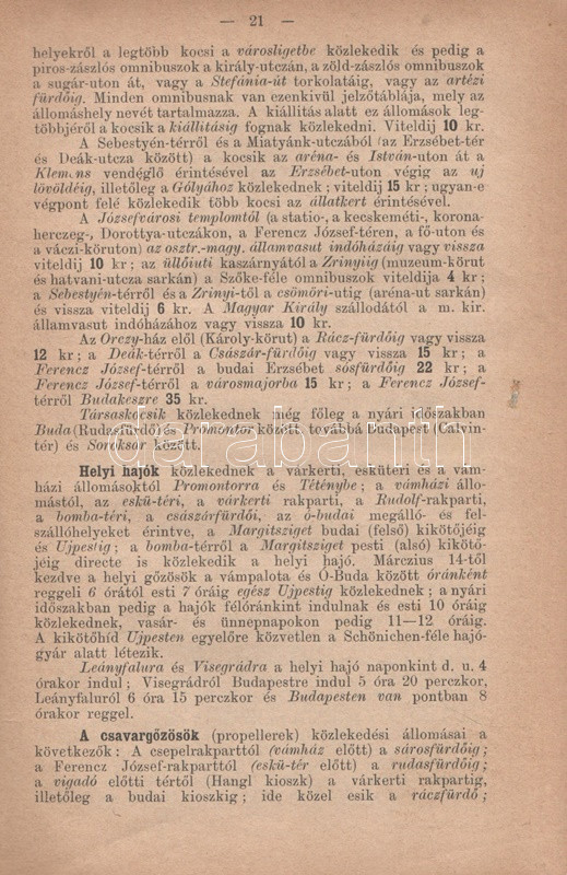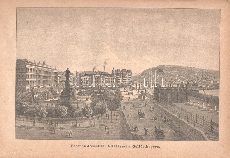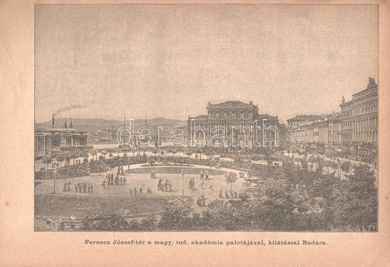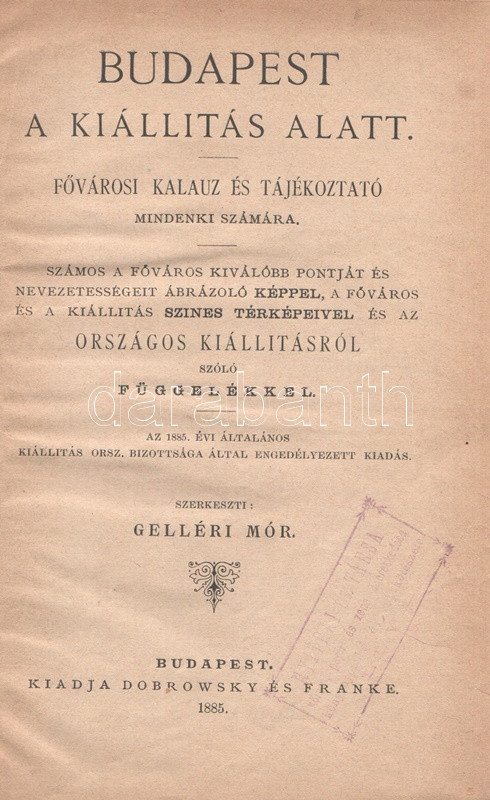 Budapest a Kiállítás alatt. Fővárosi kalauz és tájékoztató mindenki számára. Számos, a főváros kiválóbb pontját és nevezetességeit ábrázoló képpel, a főváros és a kiállítás színes térképeivel és az országos kiállításról szóló függelékkel. Az 1885. évi általános kiállítás országos bizottsága által engedélyezett kiadás. Szerkeszti: Gelléri Mór. Budapest, 1885. Dobrowski és Franke (Rudnyánszky A. ny.) 1 t. (kétoldalas címképen Budapest látképe a Gellért-hegyről) + 110 + [2] p. + 22 t. Egyetlen kiadás. Az 1870-es években megszervezett mezőgazdasági kiállítások után 1883-ban fogadta el az országgyűlés azt az indítványt, amely az 1885. évi Budapesti Országos Általános Kiállítás megrendezéséről döntött. Az 1885. május 2-án kezdődő budapesti kiállítás megnyitóján mintegy 10000-en vettek részt, a Városligetben megrendezett kiállítás az év végéig tartott nyitva, és egykorú beszámolók szerint a sokszorosan meghaladt költségvetés ellenére komoly siker volt. A kiállítási épületek többségét az év végén elbontották, csupán három épület maradt meg (az Iparcsarnok, a Királyi Pavilon és a ma Millennium Házaként ismert kiállítási épület), ezeket az egy évtizeddel későbbi, grandiózus ezredéves ünnepségsorozaton is használták. A Budapesti Országos Általános Kiállítás kalauzának fő erőssége, hogy az 1880-as évek közepének műszaki-kulturális fejlesztéseit örökíti meg, gazdag képanyaga ebbe a miliőbe kalauzol. A részletgazdag budapesti képanyagon a Sugárút fejlesztései már láthatóak, ahogyan a város kulturális és gazdasági fejlesztései és szimbolikus terei (Oktogon, Kálvin tér, Nemzeti Színház, Népszínház, budai Vár, Városligeti tó, Elevátor, Fővárosi Közvágóhíd) is megörökítik az 1880-as évek világát. Az idegenforgalmi célokat szolgáló kiadvány elsősorban modern és elegáns városként mutatja be a fővárost. A címlapon régi kereskedői bélyegzés, példányunkból egy levél és egy tábla hiányzik, a kötet két színes térképpel teljes. -- Hozzákötve: Budapesti Országos Általános Kiállítás: A Képzőművészeti Csoport képes tárgymutatója. (1885) -Budapester Allgemeine Landes-Ausstellung: Illustrierter Catalog der Abtheilung der Bildenden Künste. - Exposition Générale Nationale de Budapest: Catalogus Illustré de la Section des Beaux-Arts. Budapest, 1885. Franklin-Társulat ny. [164] p. Egyetlen kiadás. Kolligátumunk második része a három nyelvű bevezető után a kiállításon bemutatott, reprezentatív képzőművészeti anyagból mutat be válogatást, döntően a kortárs festőművészet, kiegészítően a szobrászat alkotásaiból. A festményeken politikai, historikus portrék éppúgy megjelennek, mint mitologikus aktok, népi zsánerképek, hölgyportrék; elvétve még a szegényebb városi néprétegek is helyt kapnak a kiállítási anyagban. Aranyozott, sérült gerincű, enyhén kopott korabeli félvászon kötésben, márványmintás festésű lapszélekkel. Jó példány.