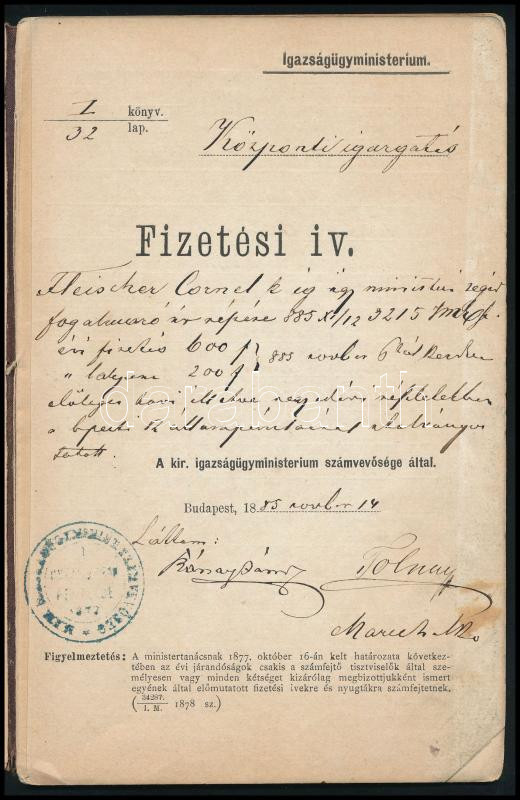 1885 Bp., Fleischer Kornél igazságügy-minisztériumi segédfogalmazó rés... https://www.darabanth.com/de/469-Fernauktion/469.0/Kunst-Dokumente-andere-Sammelgebiete/Dokument~500020/1885-Bp-Fleischer-Kornel-igazsagugy-miniszteriumi-segedfogalmazo-reszere-szolo-fizetesi~II3176238