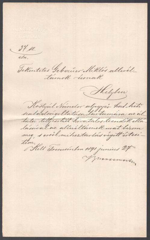Beschreibung: 1891 Trencsén vármegye alispánja (Baross Jusztin) aláírt irata