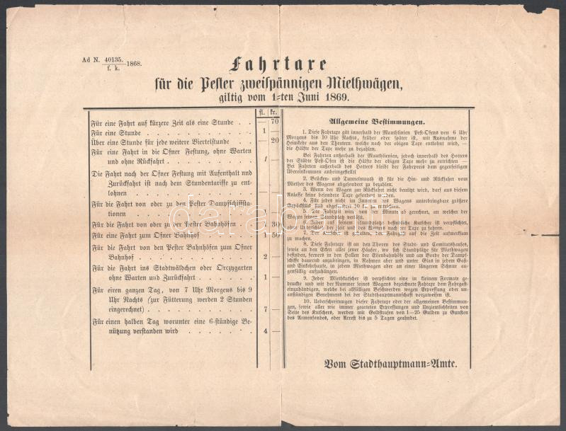 1868 Fahrtare für die Pester zweispännigen Miethwägen giltig vom 1-ten Juni 1869. / A pesti kétlovas bérkocsik viteldíjai 1869. június 1-től. Német nyelvű hirdetmény, hajtva, lapszéli szakadásokkal, 29,5x22,5 cm