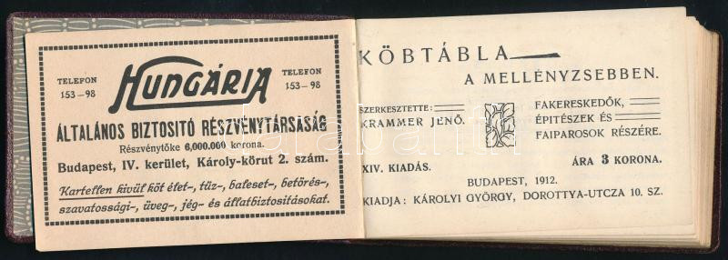 1912 Köbtábla a mellényzsebben. Fakereskedők, építészek és faiparosok részére. Szerk.: Krammer Jenő. Bp., 1912, Károlyi György, VIII+95+(17) p. Kiadói harántalakú bőrkötésben.