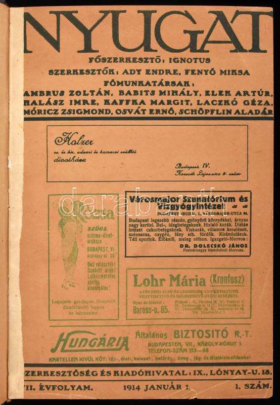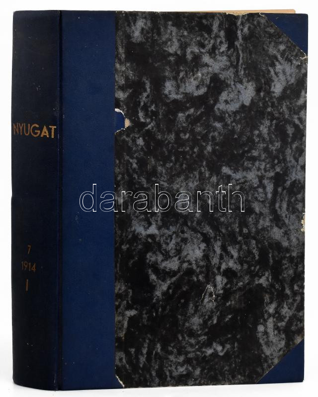 1914 A Nyugat 6 db száma egybekötve: VII. évf. 1., 3., 5-8. sz., 1914. jan. 1.- ápr. 16. Szerk.: Ignotus, Ady Endre, Fenyő Miksa. Félvászon-kötésben, helyenként kissé foltos, sérült lapokkal, néhány lap kijár.