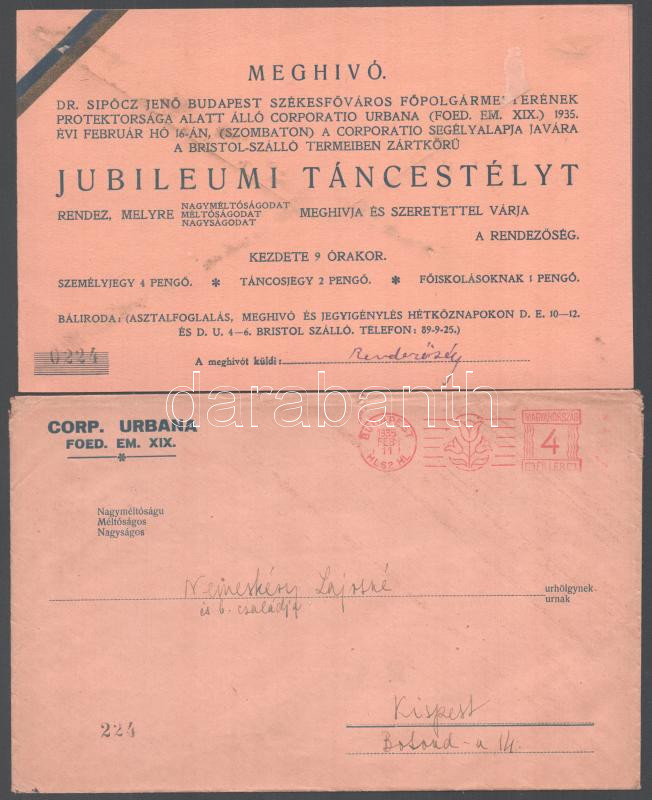 1935-1936 Vegyes meghívó tétel, 4 db, egyik borítékkal, ugyanannak a személynek a részére, Kispestre, Corporatio Urbana Foed. EM. XIX. 1935, Medikus Bál 1938, Katolikus Társaság Bálja 1935, 1936.