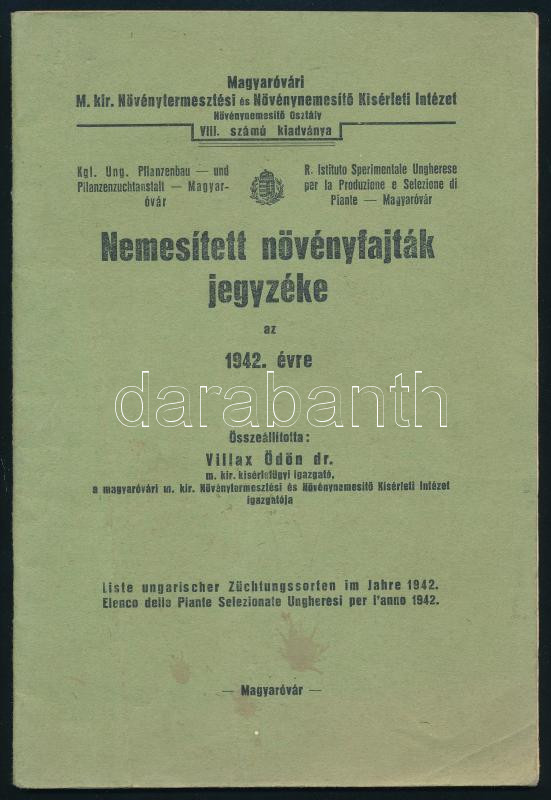 1942 Nemesített növényfajták jegyzéke az 1942. évre. Összeáll.: Villax Ödön. Magyaróvári M. kir. Növénytermesztési és Növénynemesítő Kisérleti Intézet Növénynemesítő Osztály VIII. sz. kiadványa. (Győr, Győregyházmegyei Alap-ny.), 36 p. Kiadói tűzött papírkötés, kissé foltos borítóval.