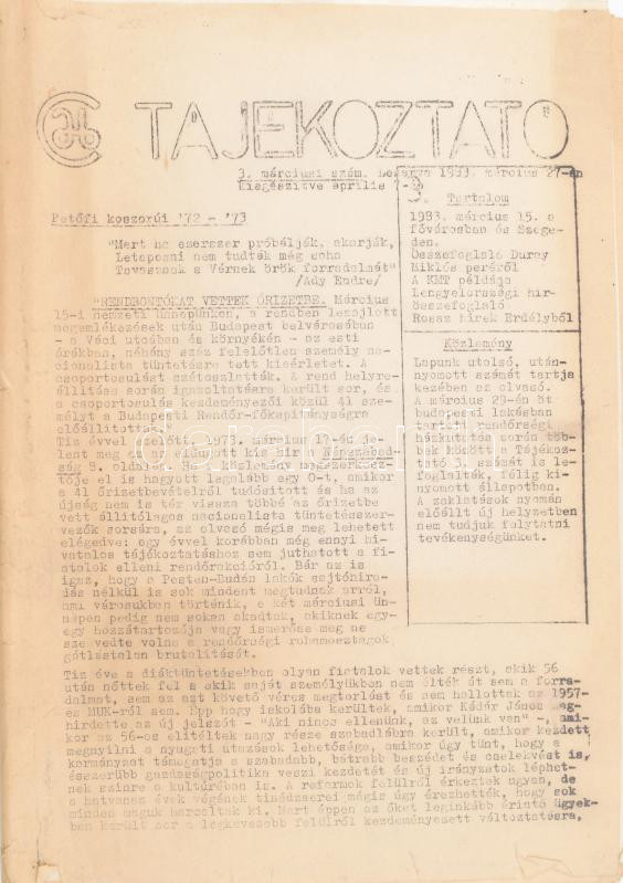 1983 A Tájékoztató c. szamizdat 2 db utolsó száma. https://www.darabanth.com/de/469-Fernauktion/469.0/Kunst-Dokumente-andere-Sammelgebiete/Drucksachen~1000014/1983-A-Tajekoztato-c-szamizdat-2-db-utolso-szama~II3176565