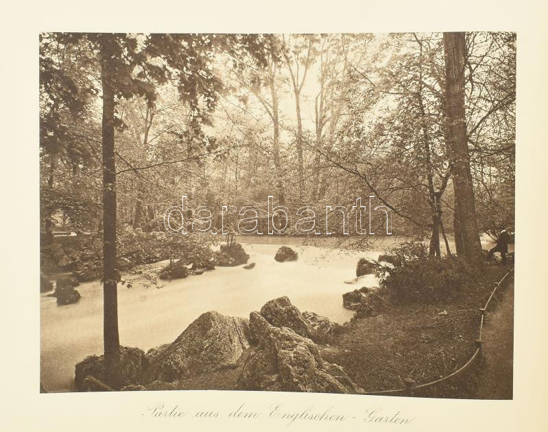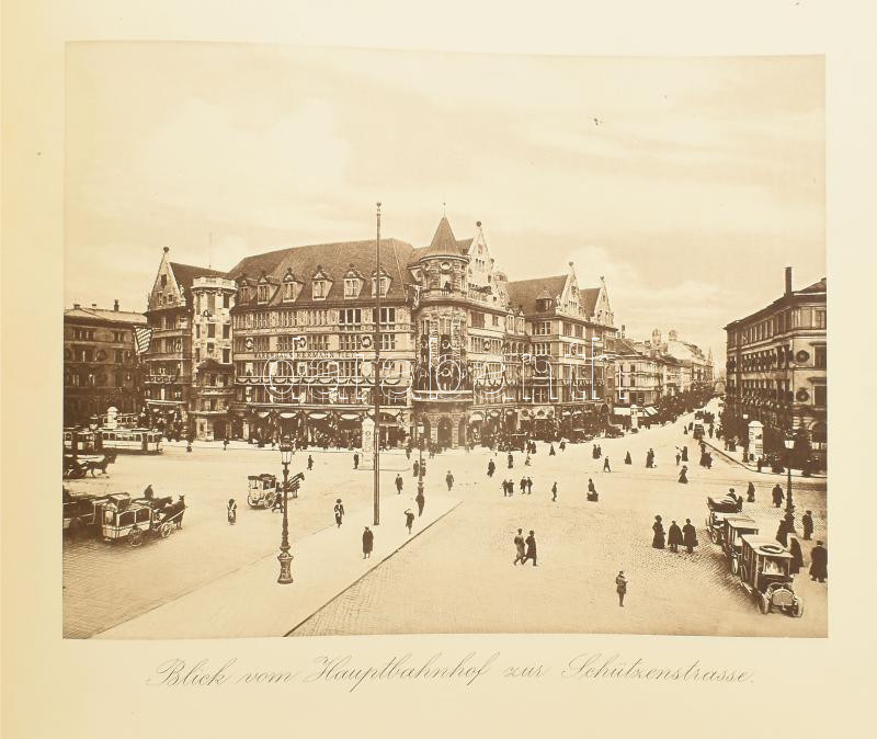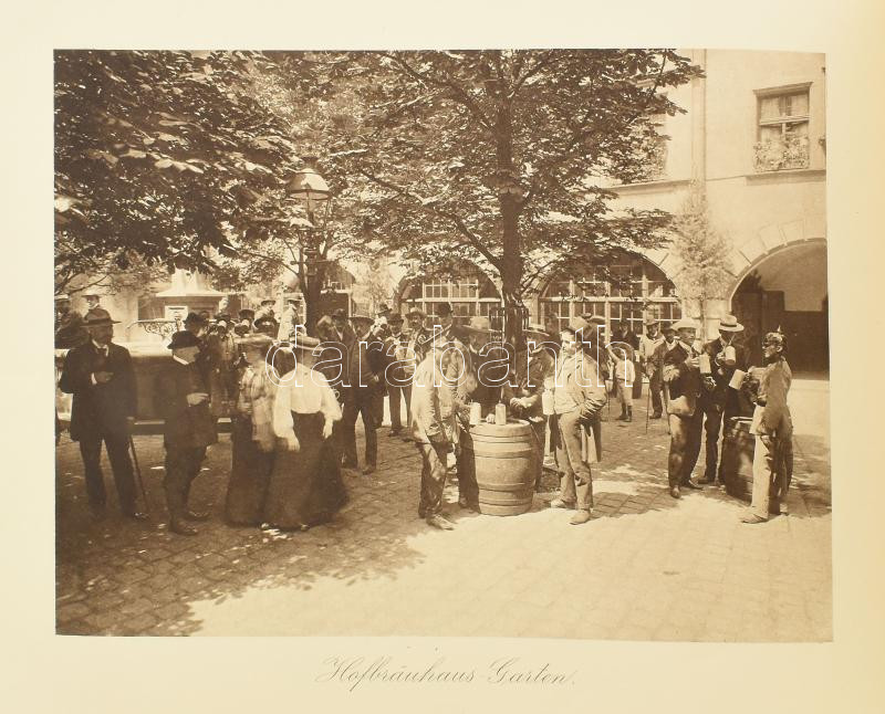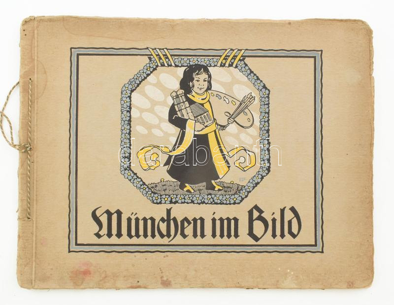 cca 1900 München im Bild. H.n., é.n., Monachia (Hermann Tietz). Fekete-fehér müncheni látképekkel, utcarészletekkel gazdagon illusztrált. Kiadó harántalakú, zsinórfűzésü papírkötésben, későbbi tulajdonosi névbejegyzéssel, foltos borítóval és részben foltos lapokkal.