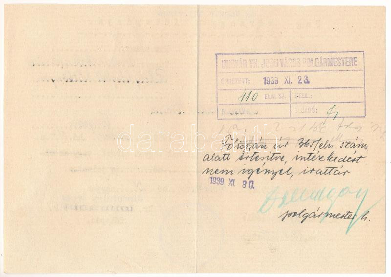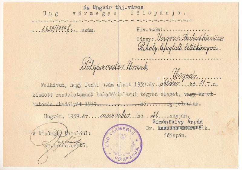 1939 Ung vármegye főispánjának levele Ungvár város polgármestere részére, melyben figyelmezteti, hogy az ungvári szabadkőműves páholy lefoglalt betétkönyveivel kapcsolatban intézkedjen.