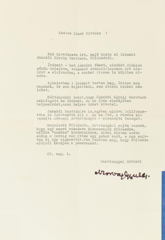1982 Morvay Gyula (1905-1998) költő, író, műfordító gépelt levele autográf aláírással Lázár Tibor (1933-?) költő részére