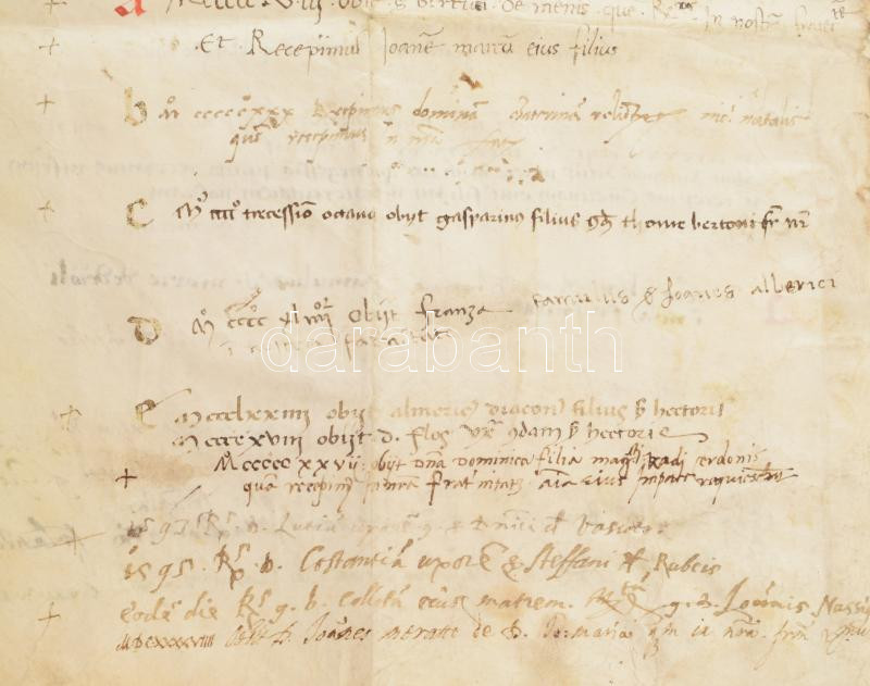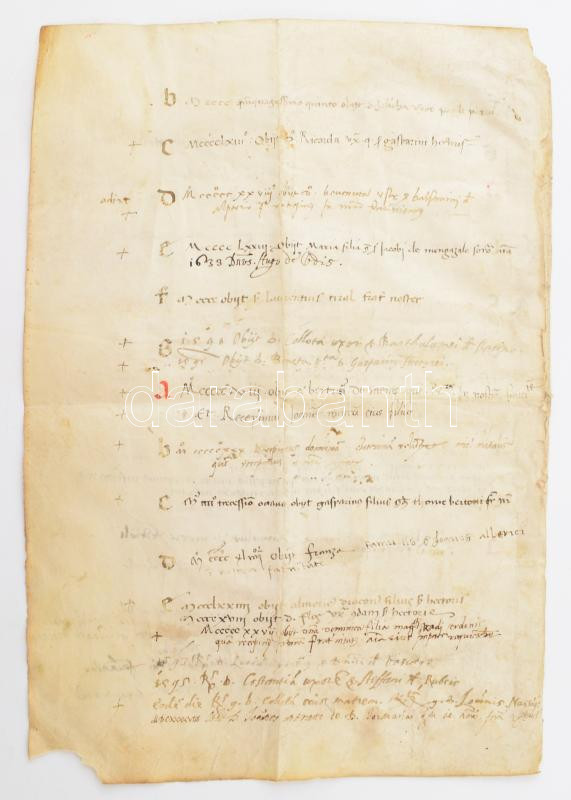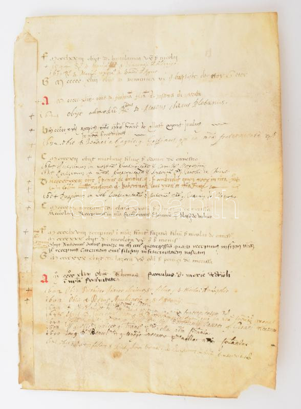 cca 1373-1460 Lap egy isztriai konfraternitás lajstromkönyvéből. A konfraternitások vallásos társulatok voltak a közép- és kora újkorban, amelyeknek egyaránt lehettek egyházi és világi tagjai. A lapon több egyházi személyt (plébánost, diakónust) is említenek. A bejegyzések nagyrészt a konfraternitás tagjainak halálát rögzítik, de vannak benne tagfelvételről szólóak is. Az első oldal tetején lévő évszám azaz az első bejegyzés 1373-as -- de nem lehet kizárni, hogy nem maradt-e le véletlenül egy század, mert a bejegyzések zöme 1400-as évekbeli. Az is világosan látszik, hogy később is használták, mert sok a 17. századi bejegyzés is, az utolsó 1654-es. Két név beazonosítható az 1543-ban elhunyt Fiorbona, Iustina de Vascotto lánya anyjával együtt néhány évvel korábban szerepel egy végrendeletben, amely Isolán kelt -- ez alapján valószínűleg valamelyik isztriai konfraternitásról lehet szó, talán Isolában vagy Capodistrián (ma mindkettő Szlovániában, Izola, ill. Koper néven). Pergamen, két kézzel beírt oldal 24x35 cm / cca 1373-1460 Sheet from the register book of an Istrian confraternity. Confraternities were religious associations in the Middle and Early Modern Ages, which could have both ecclesiastical and secular members. Several church figures (parish priest, deacon) are also mentioned on the page. The entries mostly record the death of members of the confraternity, but there are also entries about membership. The year at the top of the first page, i.e. the first entry, is 1373 -- but it cannot be ruled out that a century was accidentally left out, because most of the entries are from the 1400s. It is also clear that it was used later, because there are many entries from the 17th century, the last one from 1654. Two names can be identified: Fiorbona, the daughter of Iustina de Vascotto, who died in 1543, appears together with her mother a few years earlier in a will dated in Isola - based on this, it is probably a question of one of the Istrian confraternities, perhaps in Isola or Capodistria (today both in Slovenia, Izola and Koper named). Parchment, two handwritten pages