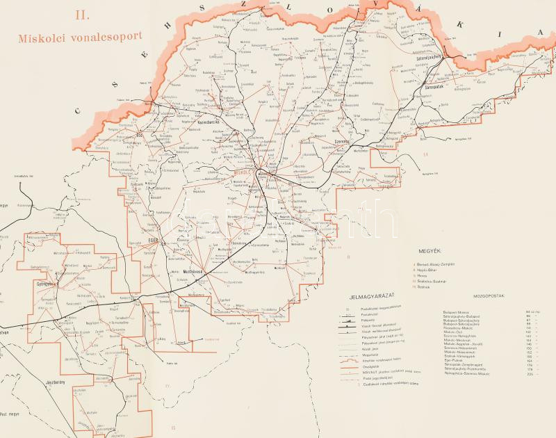 Beschreibung: 6 db területi vasútvonal térkép (debreceni vonalcsoport, miskolci vonalcsoport, stb.)