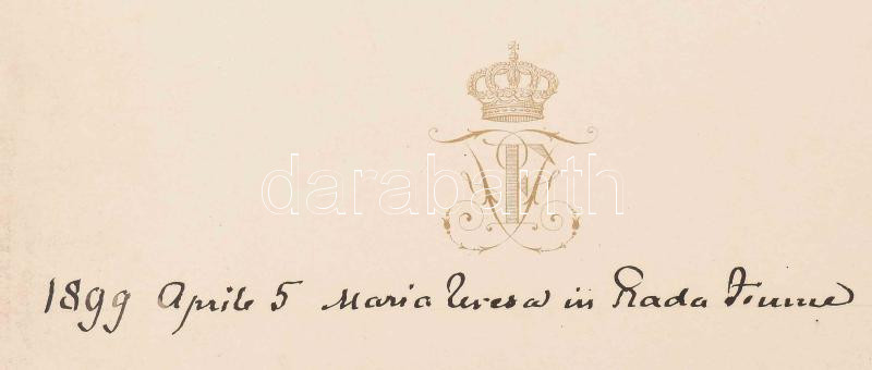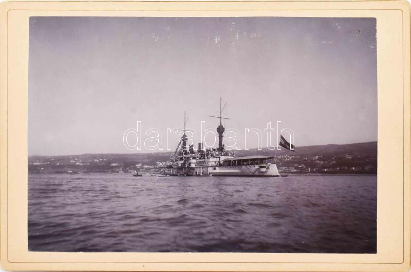 1899 Különleges fotó! Az Osztrák-magyar haditengerészet S.M.S. Kaiserin und Königin Maria Theresia páncélozott cirkálója. A fotó Ferenc Ferdinánd főherceg, Ausztria-Magyarország trónörököse, a haditengerészet védnőke személyes gyűjteményéből való. A fénykép hátoldalán Ferenc Ferdinánd monogramja és koronája látható. 16,5x11 cm / 1899 Photograph of S.M.S. Kaiserin und Königin Maria Theresia in Fiume, dated April 5, 1899. This item is from the personal collection of Archduke Francis Ferdinand, heir to the thrones of Austria-Hungary, and patron of the k.u.k. Kriegsmarine. Francis Ferdinand's cipher and crown are on the back of the photograph. Extremly rare 16,5x11 cm