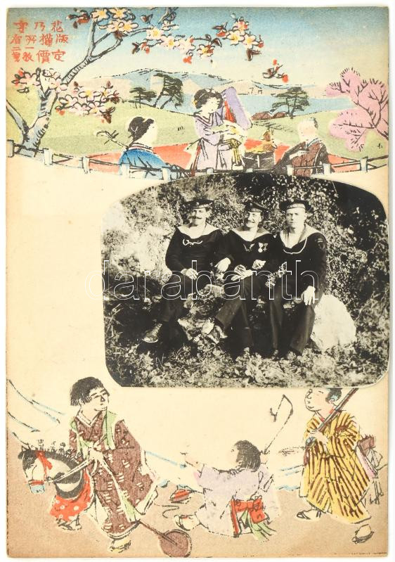 1900 Az Osztrák-magyar haditengerészet S.M.S. Kaiserin und Königin Maria Theresia páncélozott cirkálójának legénysége a boxer lázadás idején Japánban. Japán grafikával illusztrált képeslap, amelyre a tengerészek saját fotójukat illesztették be. Kihajtva: 18x14 cm / Color art and photo postcard (vertical). Japanese-made postcard with space on the front and back for the address and a message. There is no message and no address, however. Instead, three seamen from S.M.S. Kaiserin und Königin Maria Theresia decided to use it to paste a photograph as a memento of their service in the Far East at the time of the Boxer Rebellion.