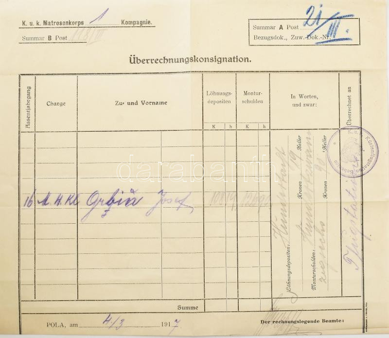 1917 Az osztrák.magyar Sibeniki repülőállomásának pecsétje hivatalos dokuemntumon / Überrechnungkonsignation from Company 1 of Matrosenkorps dated 4/3. 1917 addressed to Seeflugstation Sebenico. Official form on watermarked paper. K. u. k. Küstenflugstation Sebenico seal