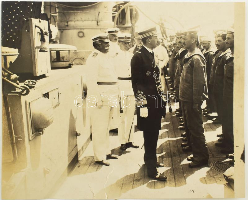 1917 IV. Károly az osztrák-magyar haditengerészet S.M.S. Novara hadihajójának fedélzetén tengerészekkel beszélget. Fotó, beszakadásokkal, 13x10 cm / Emperor Karl I visiting S.M.S. Novara and chatting with the sailors. Photo, with some tears