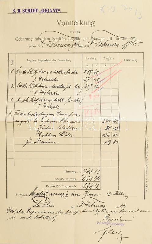 S.M.S. Gigant, officially described as a pump and salvage vessel Official form, "Note about the handling of the crew's fee for the period of February 1 through February 28, 1914," signed by the ship's commanding officer