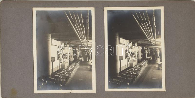 cca 1916 Az S.M.S. Erzherzog Friedrich osztrák-magyar Erzherzog-osztályú pre-dreadnought csatahajó (Linienschiff) fedélzetén ürítik a matrózok a wc-ket, éjjeliedényeket. Érdekes sztereotótó feliratozva 18x9 cm / Three-dimensional pair of cardboard-mounted photographs showing the crew's urine bottles and chamber pots being lined up. Emptying chamber pots was among the most unpleasant duties sailors had to perform. Edouard Dwořak recorded the experience in one of his cartoons. German handwritten notation on the back is illegible.