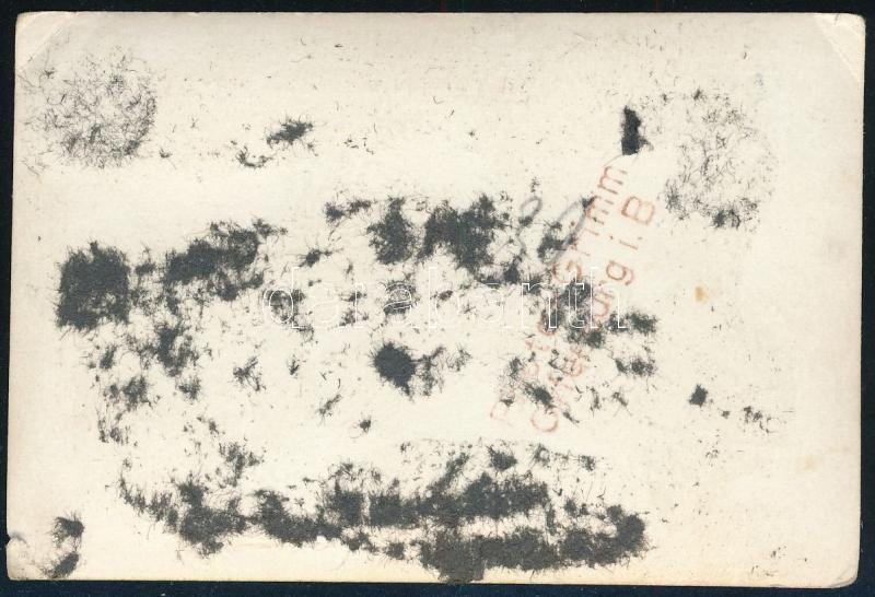 cca 1940 Német katonák folyóparti erőd (bunker) mellett, csónakkal (feltehetőleg a Rajna partján Offenburg közelében, Siegfried-vonal), fotó, a hátoldalon pecséttel jelzett (Photo-Grimm Offenburg i. B.), albumba ragasztás nyomaival, egyik sarka sérült, 9,5x6,5 cm
