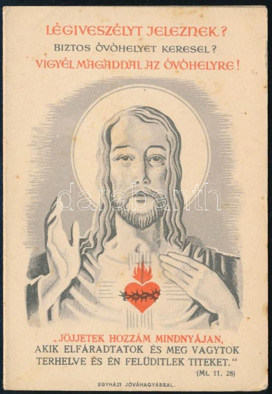 cca 1941-1944 "Légiveszélyt jeleznek? Biztos óvóhelyet keresel? Vigyél magaddal az óvóhelyre? ... Megszólal a sziréna. Mindenhol Isten kezében vagy!" II. világháborús egyházi prospektus, 2 sztl. lev., 12x8 cm