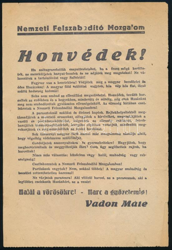 cca 1944-45 Nemzeti Felszabadító Mozgalom II. világháborús röplapja, amely a honvédeket további ellenállásra szólítja fel, másik oldalán térképpel, kisebb lapszéli szakadásokkal, 22,5x15,5 cm