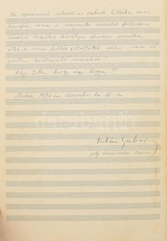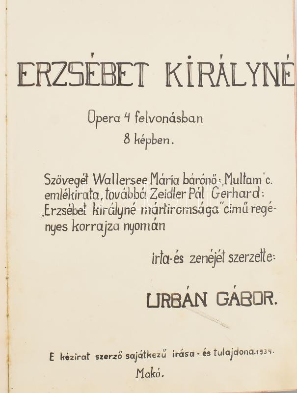 Urbán Gábor: Erzsébet királyné. Opera 4 felvonásban, 8 képben. Írta és zenéjét szerzette: - - . Makó, 1934, szerző, 4 sztl. lev.+ 364+(4) p. Saját kezű szerzői kézirat, a szereplők felsorolásával, tartalomjegyzékkel, szöveggel és kottával. Az utolsó négy oldalon ,,Az opera keletkezésének és megírásának története", a szerző elbeszélésében. Egyedi készítésű, aranyozott félbőr-kötésben, festett lapélekkel, kopottas borítóval, helyenként kissé foltos lapokkal. Urbán Gábor (1901-1984) zenetanár, zeneszerző. 1919-ben Kolozsváron szerzett tanítói oklevelet; 1923-ban polgári iskolai énektanári, 1948-ban pedig földrajz-természetrajz szakos tanári diplomát kapott. 1926 és 1948 között a makói polgári leányiskolában oktatott, emellett a Makói Dalárdában és a Petőfi Dalkörben is tevékenykedett. Zeneszerzőként főként szimfóniákat és a színpadi műveket írt; két legjelentősebb műve a Zóra és az Erzsébet királyné című operák voltak. 83 évesen, Budapesten hunyt el, sírja a makói római katolikus temetőben található.
