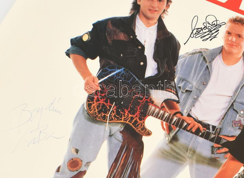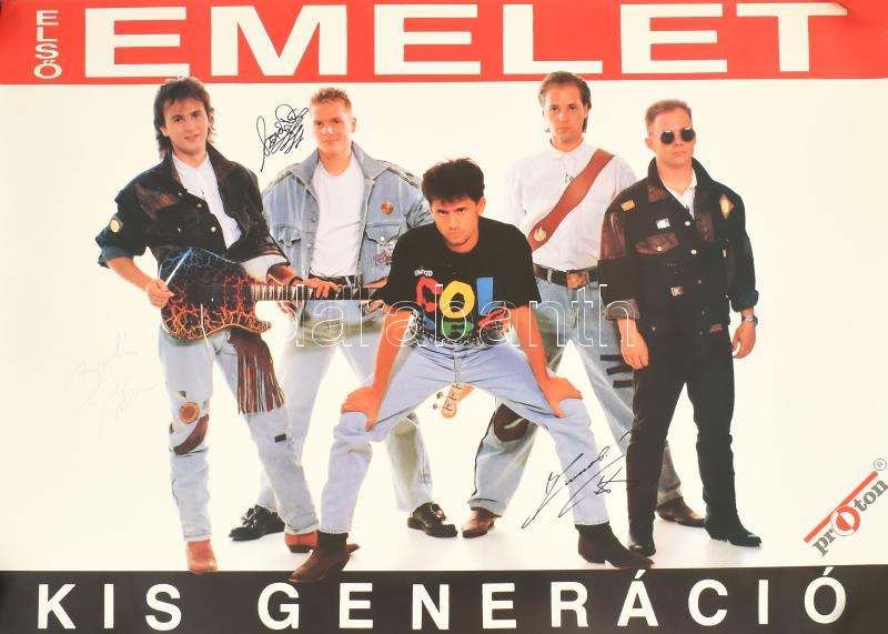 cca 1990 Első Emelet - Kis generáció poszter, rajta az albumon közreműködő zenészek aláírásaival: Bogdán Csaba gitáros, Szörényi Örs dobos, Kisszabó Gábor(?) basszusgitáros. Feltekerve, 68x48 cm.