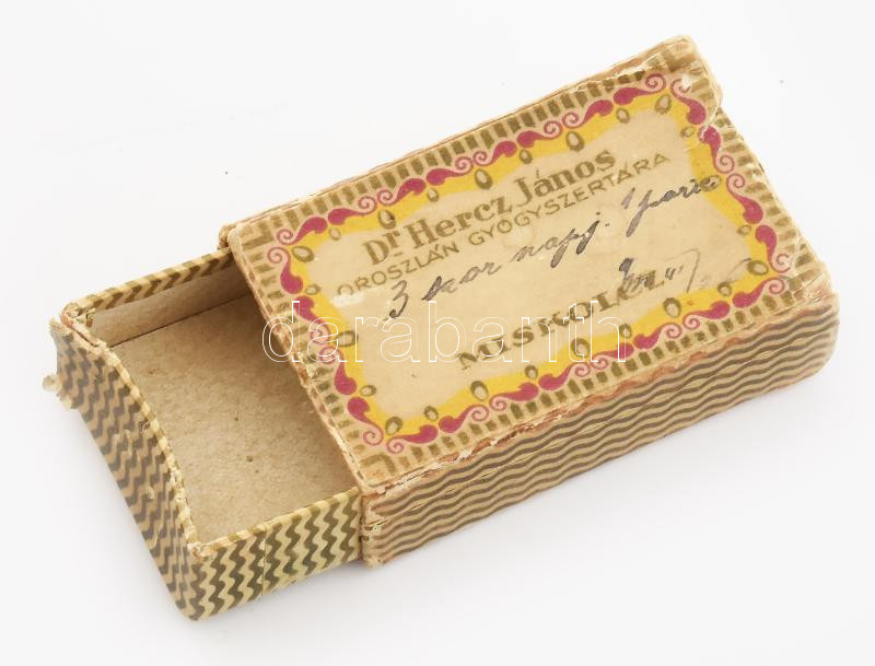 Hercz János Miskolcz gyógyszertári gyógyszeres papír doboz 6x4 cm https://www.darabanth.com/de/469-Fernauktion/469.0/Kunst-Dokumente-andere-Sammelgebiete/Werbungen~1000001/Hercz-Janos-Miskolcz-gyogyszertari-gyogyszeres-papir-doboz-6x4-cm~II3107568
