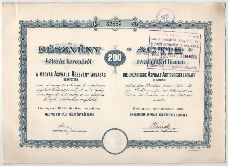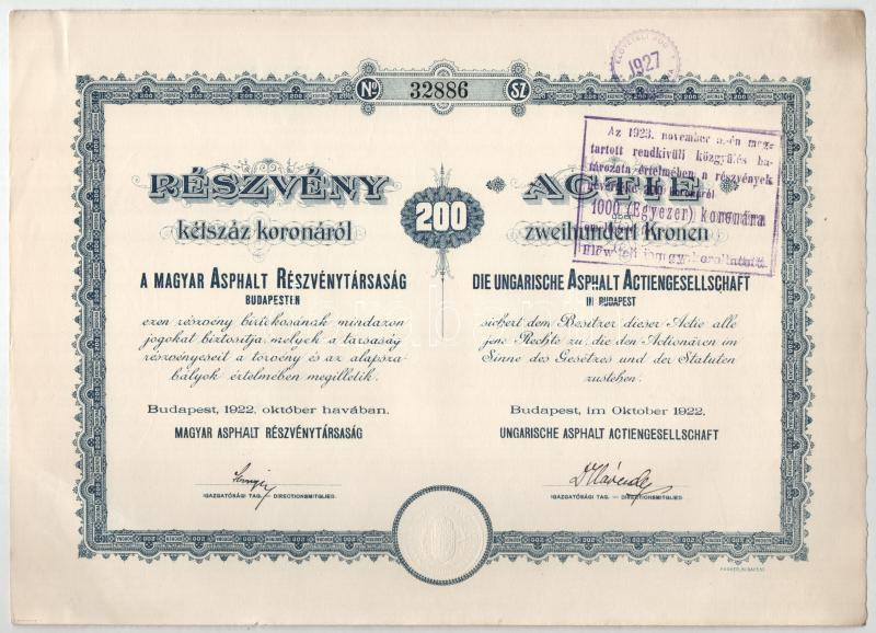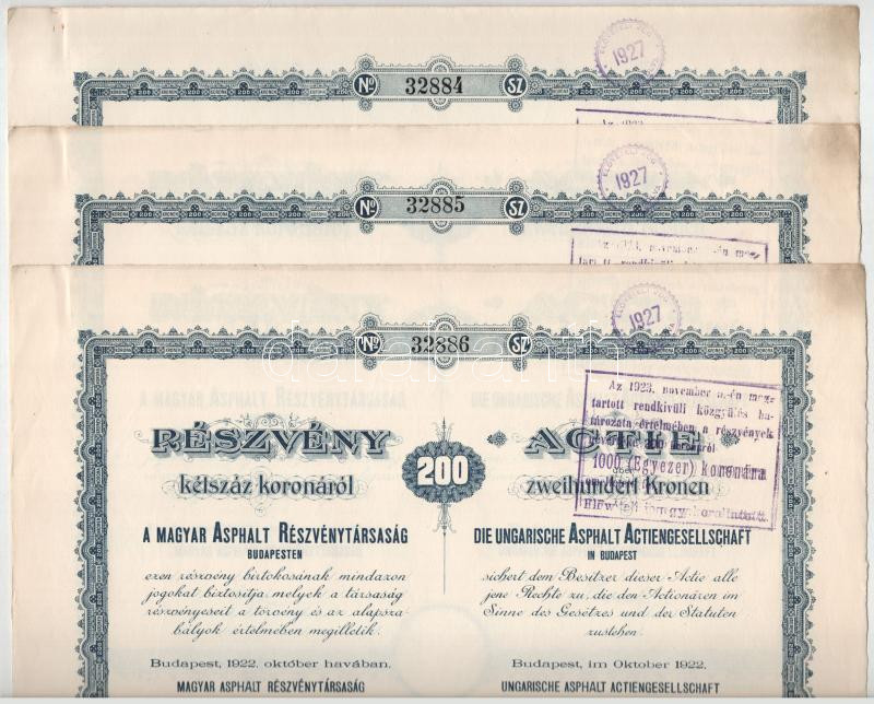 Budapest 1920. "Magyar Asphalt Részvénytársaság" részvénye 200K-ról, magyar és német nyelven, szelvények nélkül, szárazpecséttel, felülbélyegzésekkel (3x) sorszámkövetők "32884-32886" T:XF a lapok egyik sarkánál gemkapocs nyom