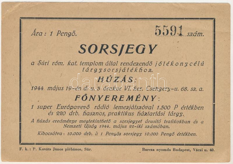Súr 1944. "Súri Római Katolikus Templom által rendezendő jótékony... https://www.darabanth.com/de/469-Fernauktion/469.0/Numismatik/Aktien-und-Tickets~2000006/Sur-1944-Suri-Romai-Katolikus-Templom-altal-rendezendo-jotekonycelu-targysorsjatek-1P~II3132202