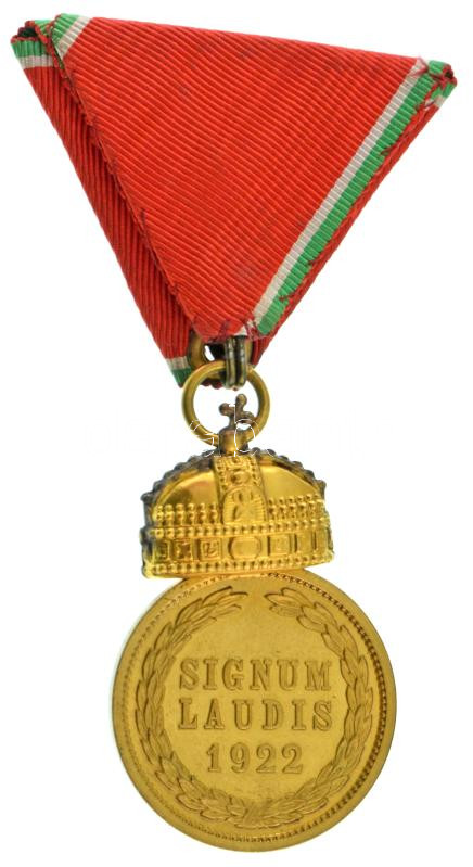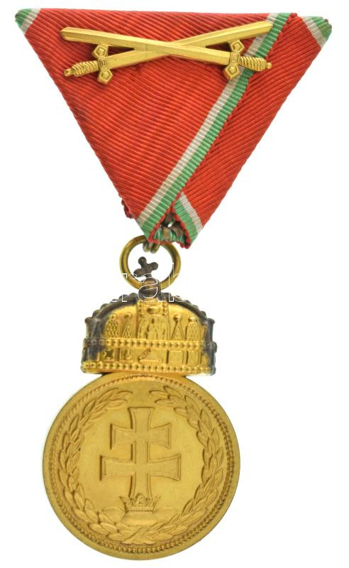 1922. "Magyar Koronás Bronzérem hadiszalagon, kardokkal" aranyozott bronz kitüntetés eredeti mellszalaggal T:AU,XF koronán patina, foltos mellszalag Hungary 1922. "Hungarian Bronze Medal with the Holy Crown with swords on war ribbon" gold plated bronze decoration with ribbon C:AU,XF patina on the crown, spotted ribbon NMK 415.