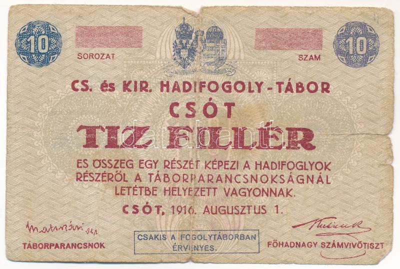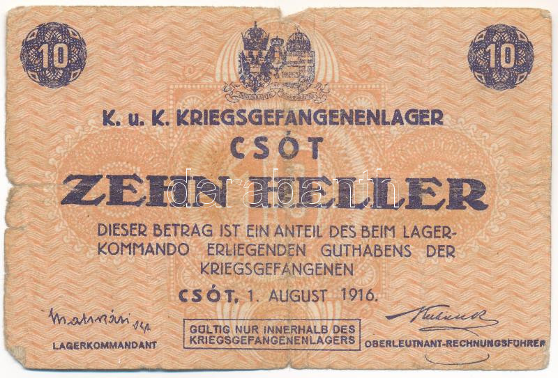 Csót / Hadifogolytábor 1916. augusztus 1. 10f számozás és aláírással n... https://www.darabanth.com/de/469-Fernauktion/469.0/Numismatik/Notgeld-aus-Papier-und-Metall~2000007/Csot-Hadifogolytabor-1916-augusztus-1-10f-szamozas-es-alairassal-nelkul-TVG-szakadas~II3170439