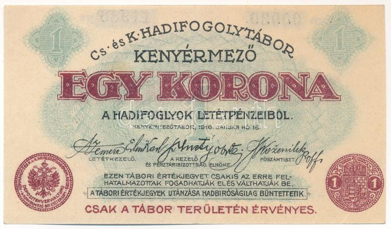 Kenyérmező / Hadifogolytábor 1916. január 15. 1K arab sorozat- és sors... https://www.darabanth.com/de/469-Fernauktion/469.0/Numismatik/Notgeld-aus-Papier-und-Metall~2000007/Kenyermezo-Hadifogolytabor-1916-januar-15-1K-arab-sorozat-es-sorszammal-TF-Adamo-HHK-16~II3170366