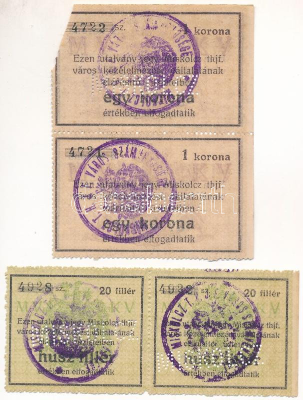 Beschreibung: Miskolc ~1918-1919. 20f + 1K "Miskolcz thjf." utalvány-jegy 2db kettes ívben, mind "MISKOLCZ" perforációval, bélyegzéssel T:AU Adamo MIS-10, 30