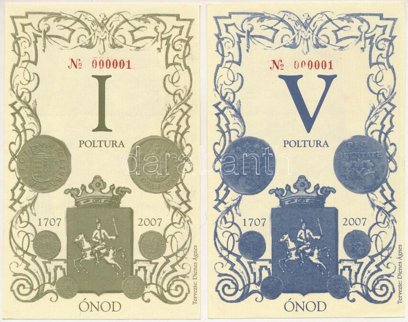Ónod 2007. I + V Poltura, mindkettő "000001" számozással T:U... https://www.darabanth.com/de/469-Fernauktion/469.0/Numismatik/Notgeld-aus-Papier-und-Metall~2000007/Onod-2007-I-plus-V-Poltura-mindketto-000001-szamozassal-TUNC~II3174101