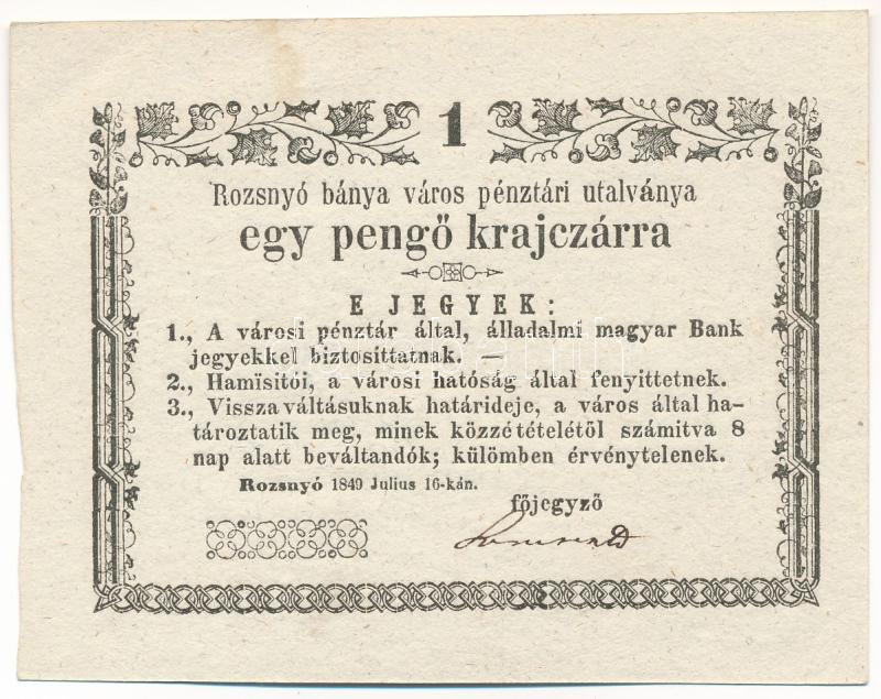 Rozsnyó 1849. július 16. 1kr "Rozsnyó bánya város pénztári utalvá... https://www.darabanth.com/de/469-Fernauktion/469.0/Numismatik/Notgeld-aus-Papier-und-Metall~2000007/Rozsnyo-1849-julius-16-1kr-Rozsnyo-banya-varos-penztari-utalvanya-TAU-Hungary-RozsnyC3~II3161337