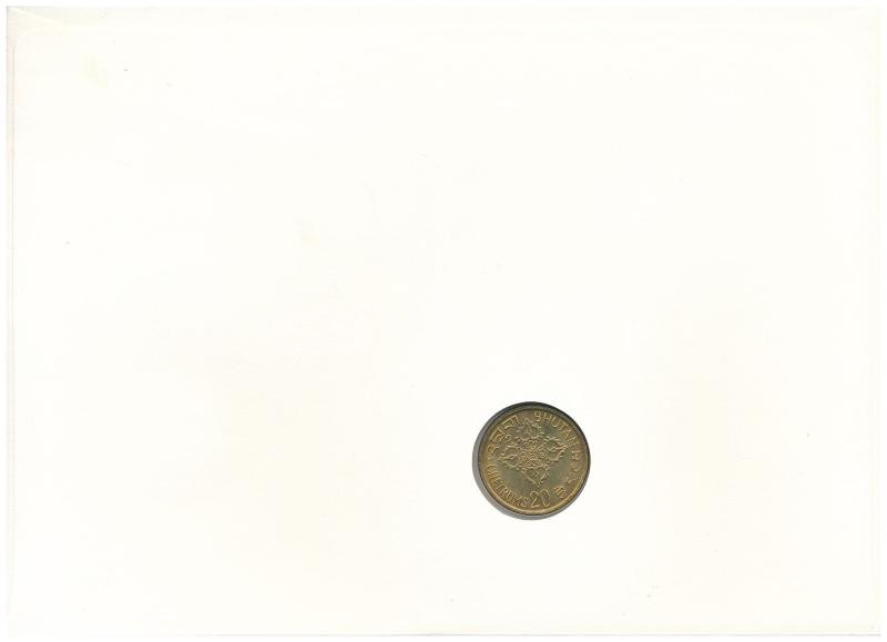 Bhután 1974. 20ch Cu-Al-Ni "FAO" forgalmi emlékérme felbélyegzett borítékban, bélyegzéssel T:AU Bhutan 1974. 20 Chetrums Cu-Al-Ni "FAO" circulating commemorative coin in envelope with stamp, and cancellation C:AU
