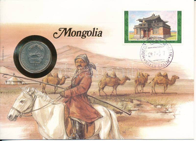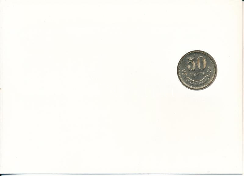 Mongólia 1981. 50M Cu-Ni felbélyegzett borítékban, bélyegzéssel, német nyelvű leírással T:UNC Mongolia 1981. 50 Möngö Cu-Ni in envelope with stamp, cancellation and a prospectus in german C:UNC