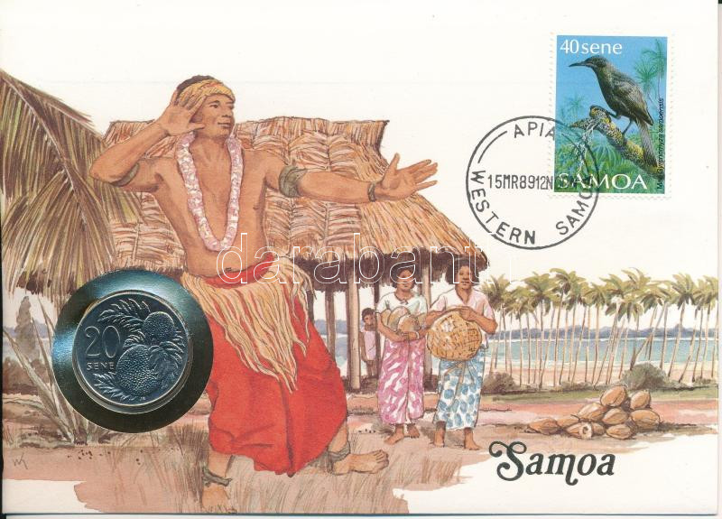 Szamoa 1988. 20s Cu-Ni felbélyegzett borítékban, bélyegzéssel, német nyelvű leírással T:UNC Samoa 1988. 20 Sene Cu-Ni in envelope with stamp, cancellation, and a description in german C:UNC