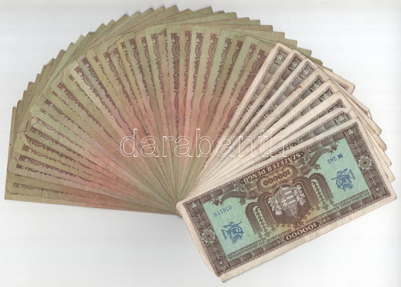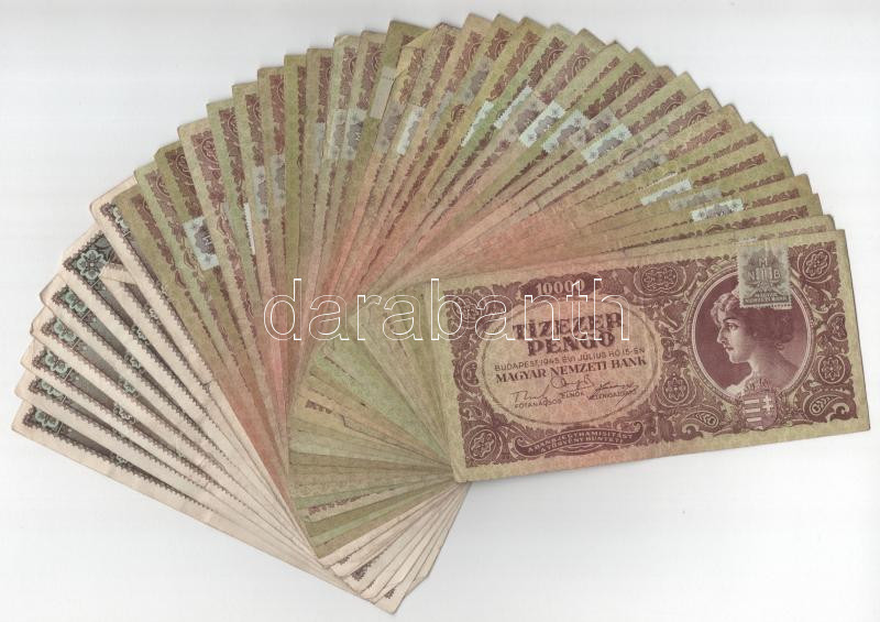 1945. 10.000P (32x) + 100.000P (8x) T:F https://www.darabanth.com/de/469-Fernauktion/469.0/Numismatik/Ungarische-Banknoten~2000008/1945-10000P-32x-plus-100000P-8x-TF~II3172329