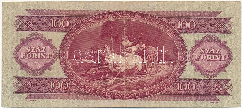 1949. 100Ft "B 335 054206" ferde nyomattal és nyomdai papírr... https://www.darabanth.com/de/469-Fernauktion/469.0/Numismatik/Ungarische-Banknoten~2000008/1949-100Ft-B-335-054206-ferde-nyomattal-es-nyomdai-papirrancokkal-TF-VG-Adamo-F28~II3168913