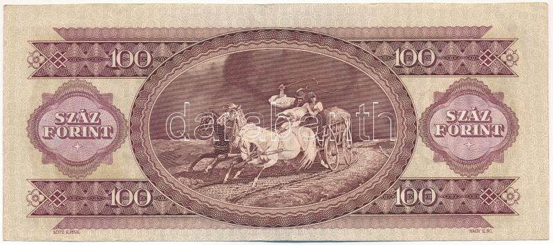 Beschreibung: 1980. 100Ft "B 082 128313" vágáshibás (széltében kb. 3mm-rel nagyobb méretű bankjegy), eltolódott nyomat T:F erős papír
