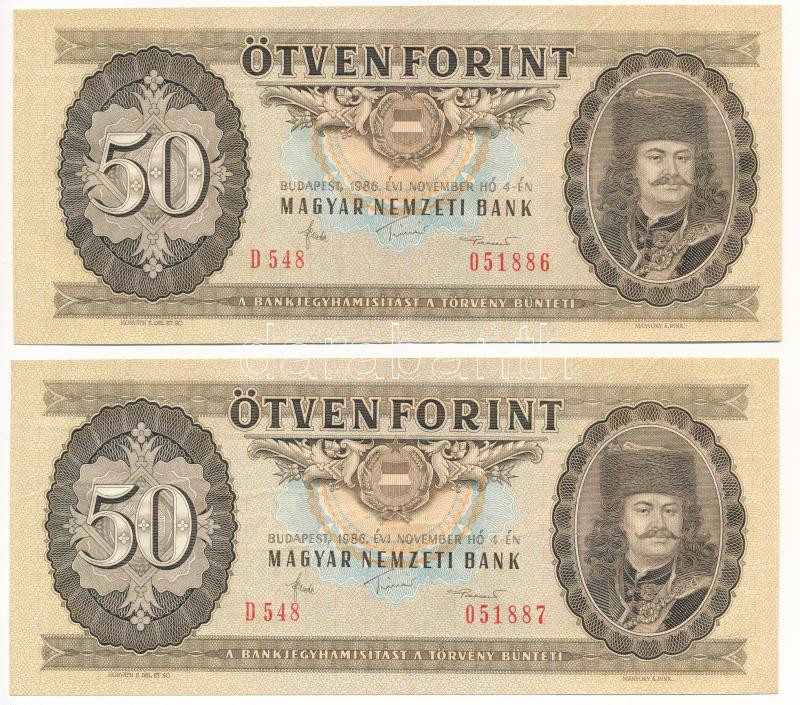 1986. 50Ft (2x) sorszámkövetők "D 548 051886 - D 548 051887"... https://www.darabanth.com/de/469-Fernauktion/469.0/Numismatik/Ungarische-Banknoten~2000008/1986-50Ft-2x-sorszamkovetok-D-548-051886-D-548-051887-nyomdai-papirranccal-TAU-XF-Adam~II3153613